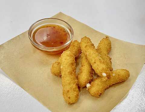 Жареный сыр в хрустящей панировке. Подается с соусом чили.